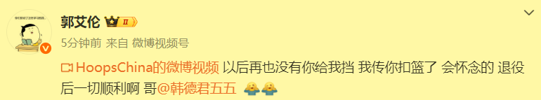 大韩退役了,作为曾经的内外线搭档和私交甚好的前队友,目前在广州队效力的郭艾伦,也对自己的老大哥的退役表达了不舍。他说,从此以后再也没有彼此间无比熟悉的挡拆扣篮了,会非常怀念。同时,也祝大韩退役以后一切顺利!
